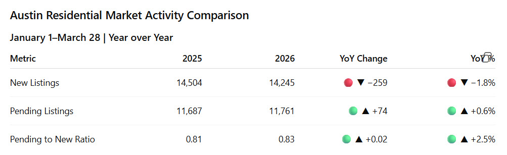 Austin residential (Jan 1–Mar 28): new listings are down 1.8% YoY, pending contracts are up 0.6% YoY, and absorption has improved to 0.83. Buyers are taking a larger share of available inventory as we close out March.